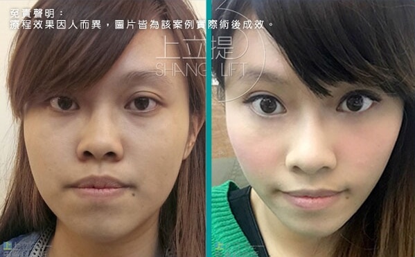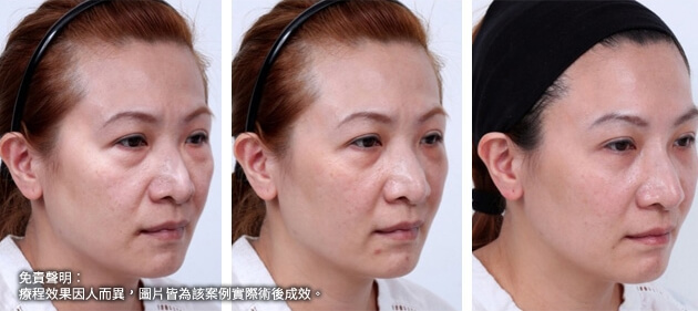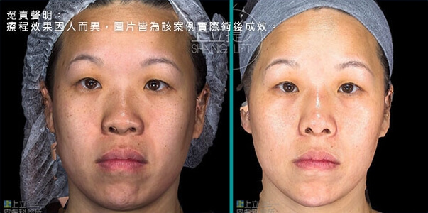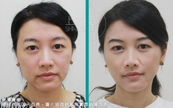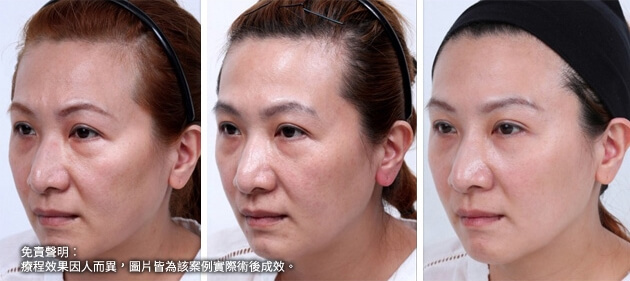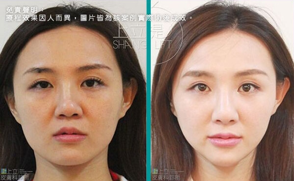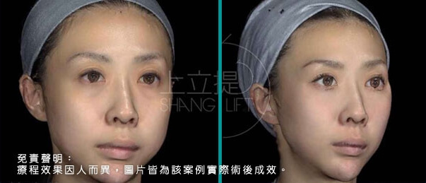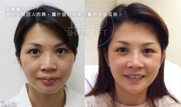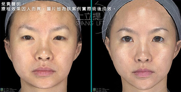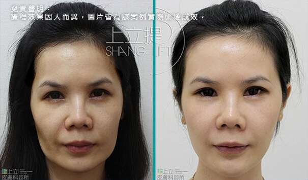 此患者接受了3D聚左旋乳酸的治療,經過三個月後,可以觀察到患者的眉尾提高了,眼尾也自然上揚,眉眼舒展開來顯得更年輕優雅;淚溝、法令紋變淺,兩頰拉提上來,輪廓變得清晰緊緻。膠原蛋白的增生效果可達二十五個月,上立提(ShangLift)陪你一起找回年輕的自己。