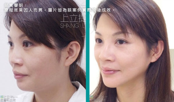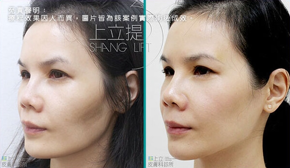 上立提(ShangLift)陪你一起找回年輕的自己。 上立提(ShangLift)根據每個人不同的情況做調整治療,因此可以得到最適合每個 人的樣子,展現出每個人獨一無二的自然美感。膠原蛋白的增生可以改善老化的凹陷鬆弛,臉部線條變得輕盈俐落,經過上立提(Shang Lift)調整治療過後的臉部線條自然柔和,呈現出年輕優美的輪廓。