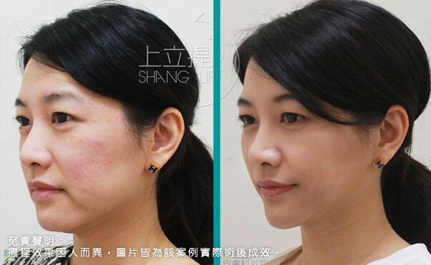 上立提Shanglift以注射的方式幫助皮膚新生膠原蛋白,傷口小,易照顧,不影響生活作息,無須恢復期、治療後無明顯痕跡,術後可以直接上班。新生的膠原蛋白可改善因老化造成的鬆弛及凹陷,並產生拉提作用,使臉部肌膚自然而然回到年輕時的樣子。 -