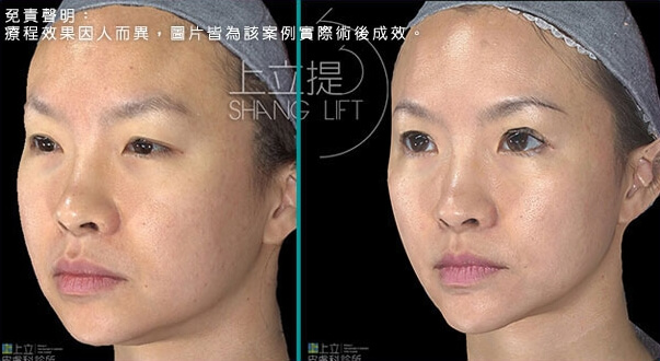 上立提Shanglift以注射的方式幫助皮膚新生膠原蛋白,傷口小,易照顧,不影響生活作息,無須恢復期、治療後無明顯痕跡,術後可以直接上班。新生的膠原蛋白可改善因老化造成的鬆弛及凹陷,並產生拉提作用,使臉部肌膚自然而然回到年輕時的樣子。