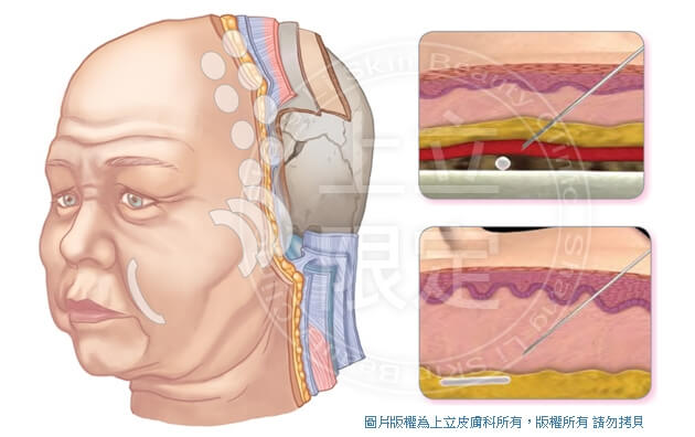 液態拉提上立提Shang Lift所採用的注射拉提技術,是將聚左旋乳酸Sculptra,成份名為PLLA或晶亮瓷Radiesse以林上立醫師創新專業的施打技術,固定拉提位移的組織,因應不同臉型與老化問題適當的在肌膚不同深度及部位分配,運用最適合東方臉型量身訂作的特殊注技巧,打造完美的臉部緊緻立體線條,能大幅提昇如同手術般的拉提效果且兼顧自然,上立提的治療就是改變骨架、輪廓,在治療過後「看起來」年輕許多,更可以讓五官輪廓更立體、精緻,精隨便是在於「顳部」附近的支撐,利用精準的劑量分配以及下針,增加髮際線附近的骨架支撐,達到拉提、緊緻的效果,效果有如手術拉提的堅固,卻沒有手術拉提的不自然,特別適合鬆垮、下垂的患者塑造出完美臉型。