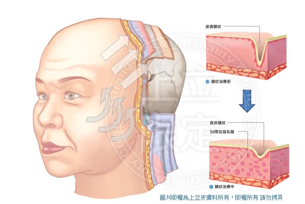 林上立醫師以自己在皮膚科多年臨床經驗後所研究發展出的治療手法,醫師會依據每一個病患不同的臉形輪廓,做不同的規劃和分配,在適當的部位施打可以生長膠原蛋白的3D聚左旋乳酸,根據每個人不同情況做規劃,可以得到更精緻更適合自己的效果。 -